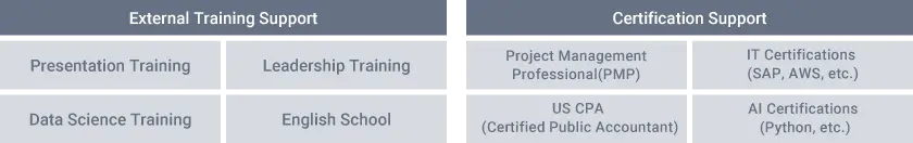 To support employees in enhancing their consulting skills and developing their careers, we subsidize costs for certifications, off-site training programs, English language courses, and more.