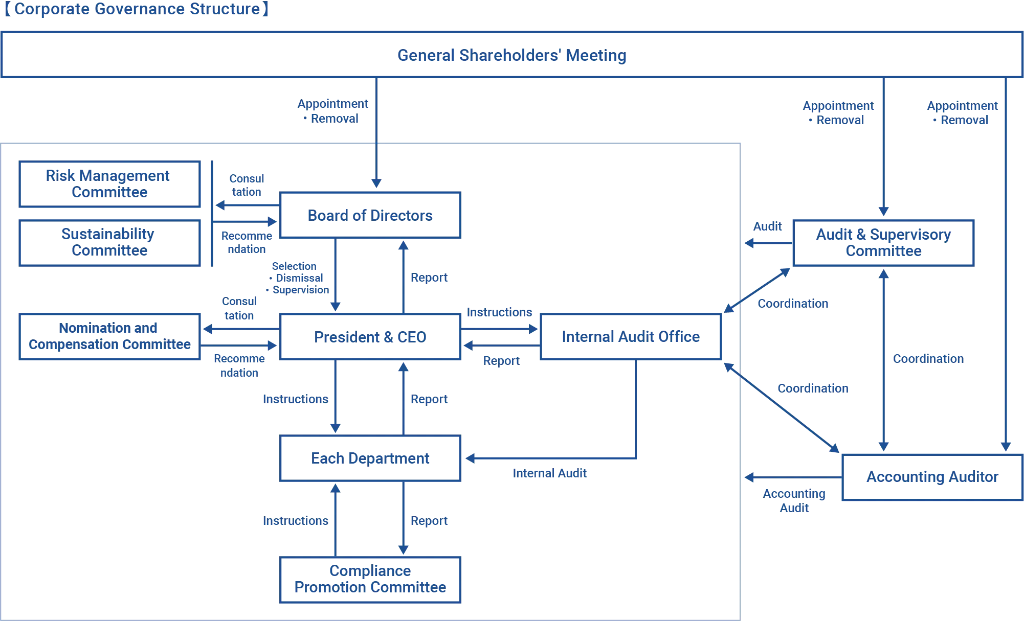 We are a company with an Audit & Supervisory Committee. We have built a corporate governance structure centered on the Board of Directors, and an Audit & Supervisory Committee.