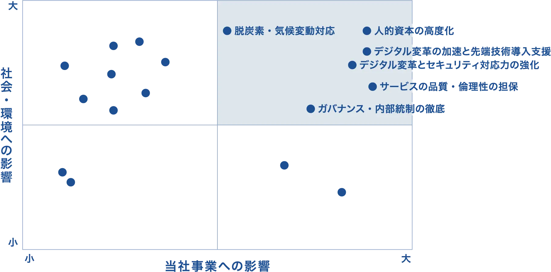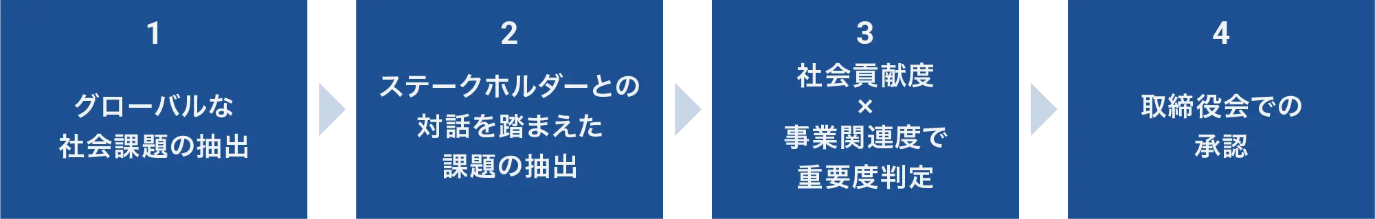 当社はダブルマテリアリティの原則に基づき、年1回以上の見直しを行い、取締役会承認の下でマテリアリティを特定しています。外部ステークホルダーの意見を考慮して課題を抽出し、社会・環境への影響と当社事業への影響に関するマトリクスにより優先順位付けを実施します。その後、社内のリスクマネジメントシステムに則って目標・指標を設定の上、取締役会にて管理しております。