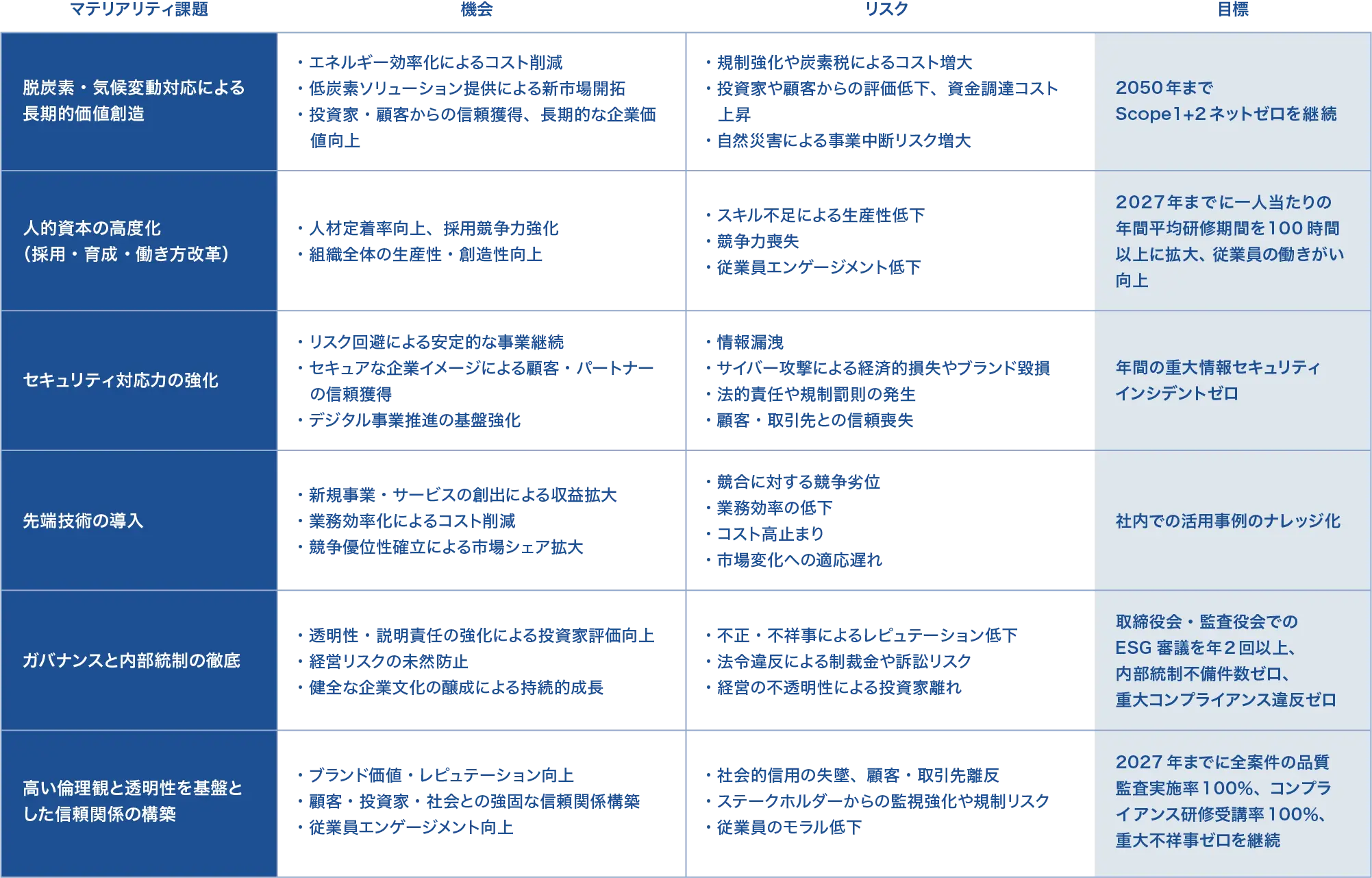 当社は特定したサステナビリティに関連する機会およびリスクを以下の通り認識し、各マテリアリティにおいて目標を設定しております。