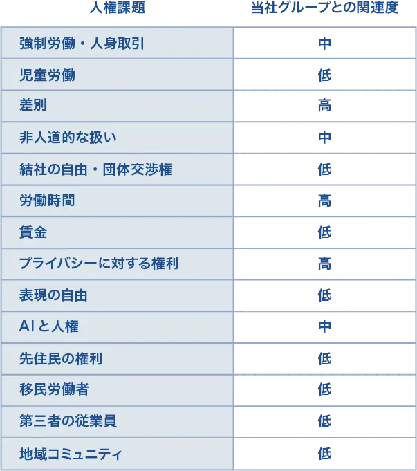 上記人権リスクの特定については年に1度、当社グループの事業内容を踏まえて見直しを行っております。
